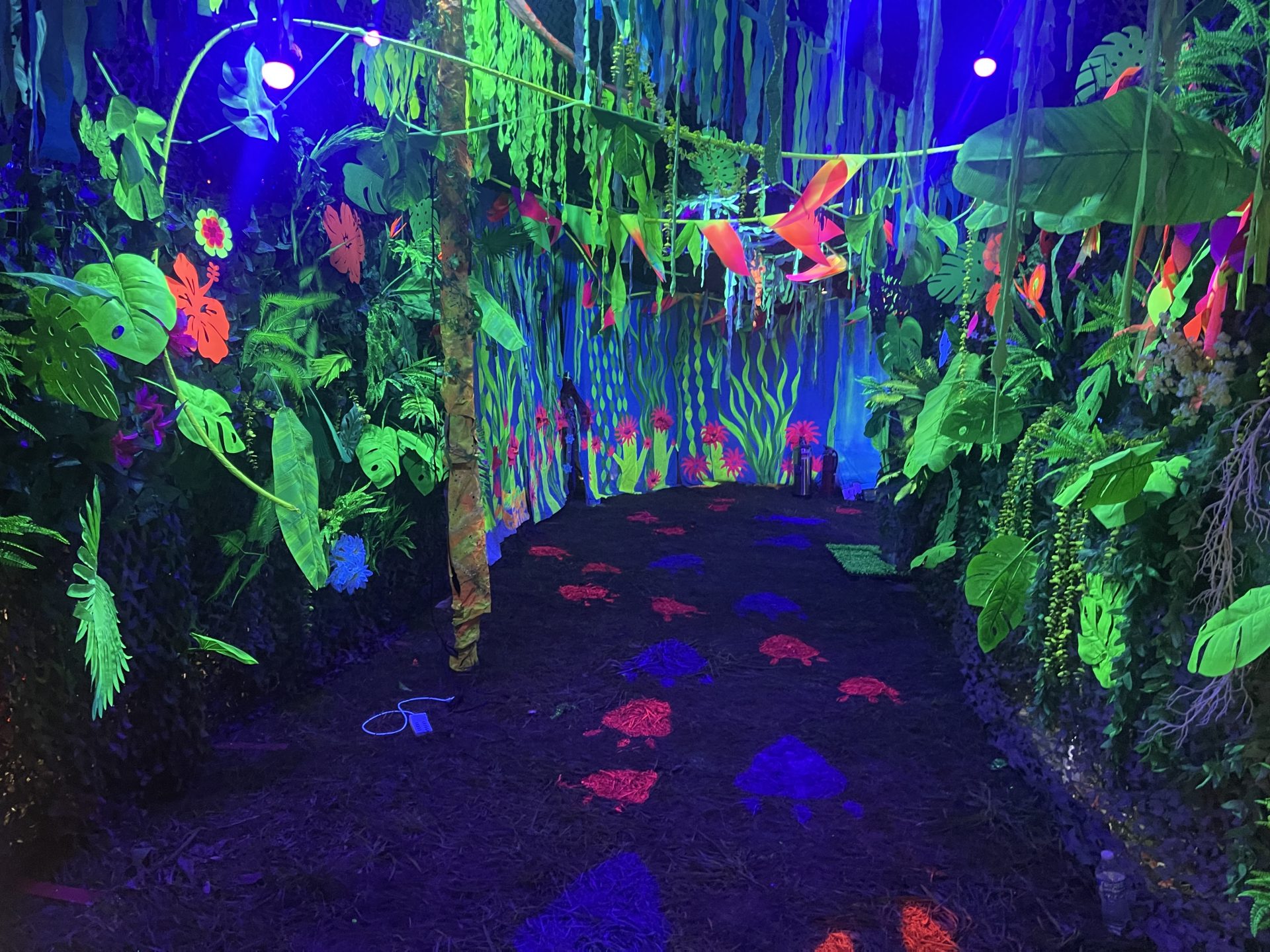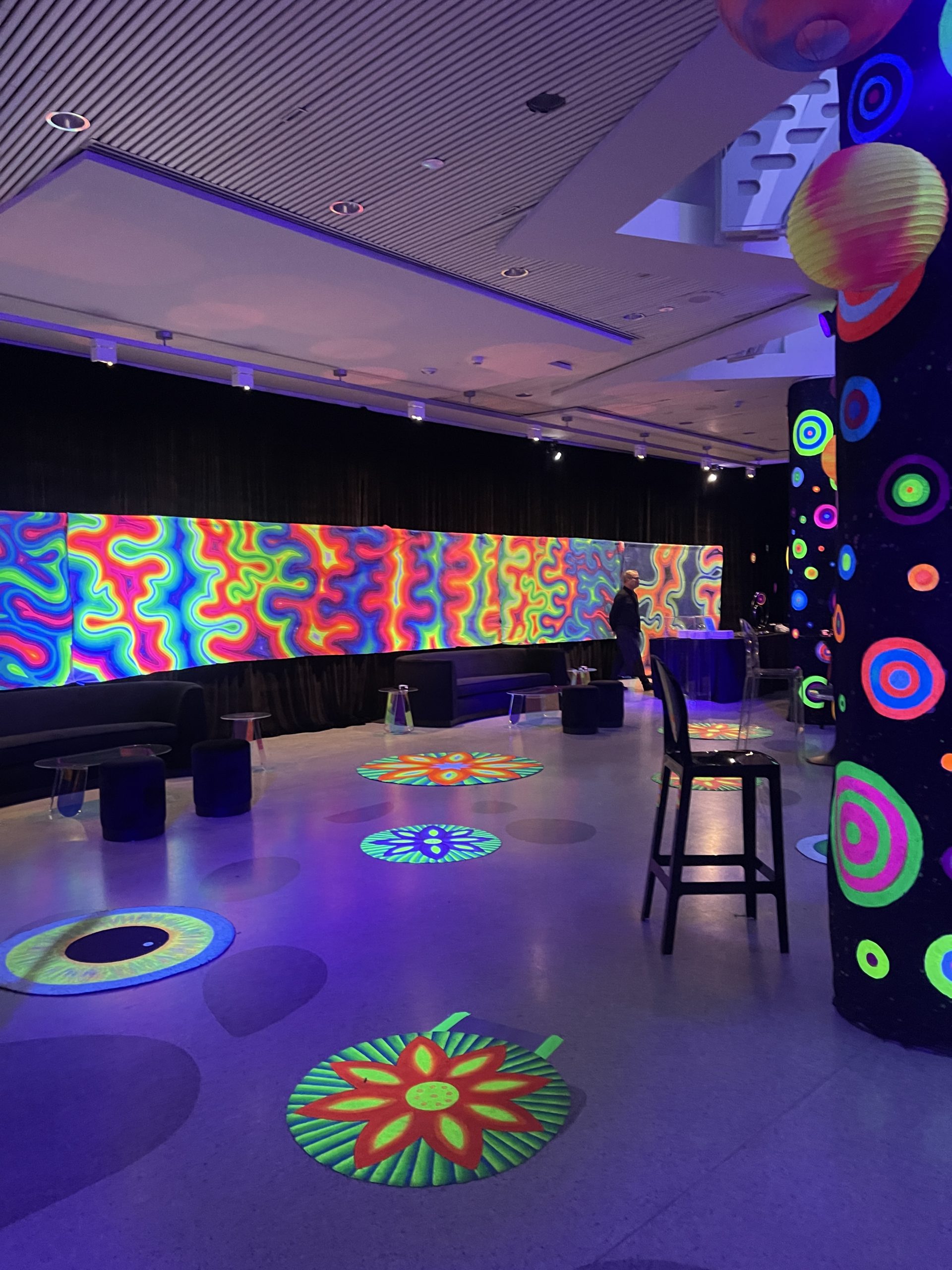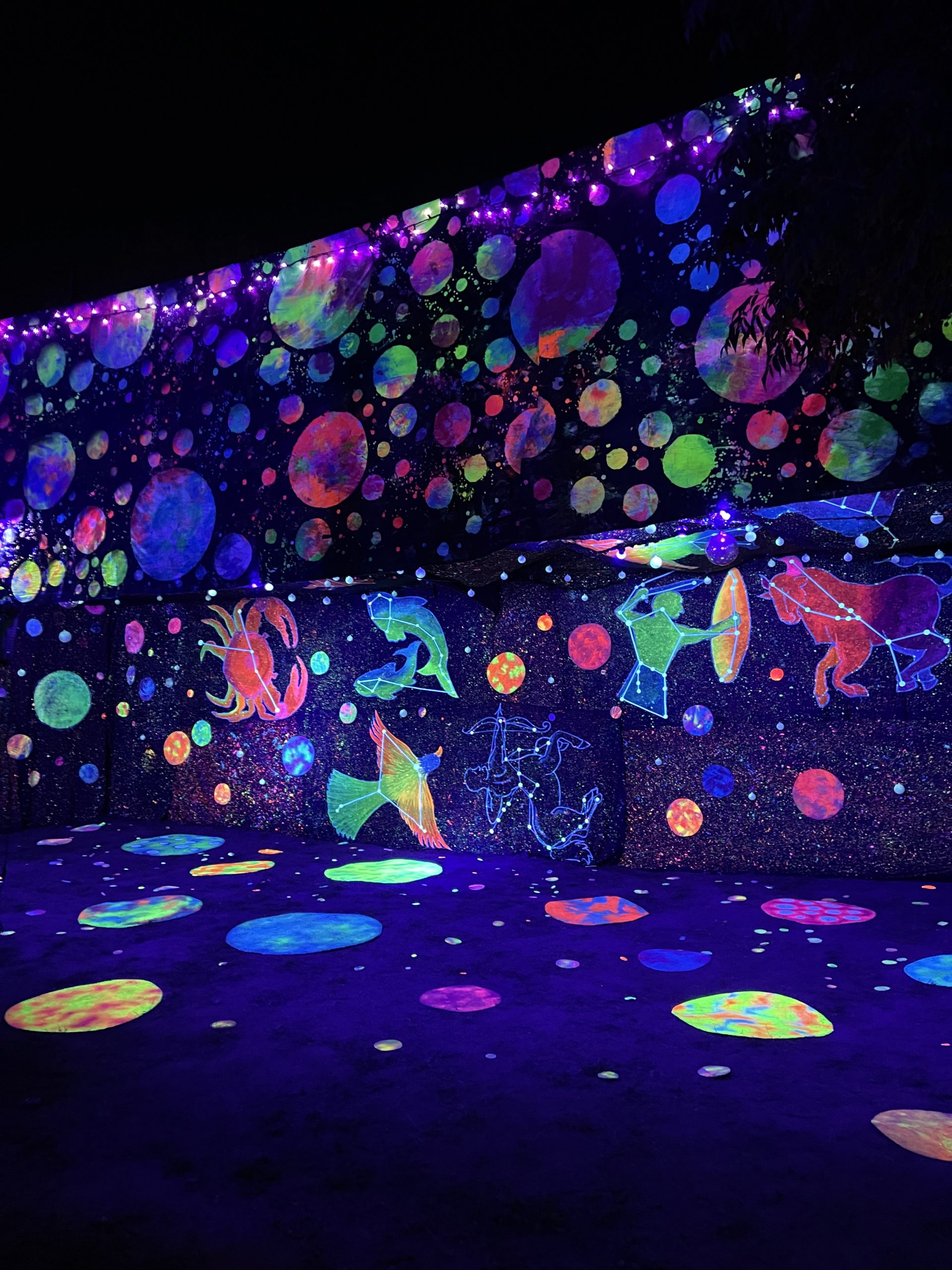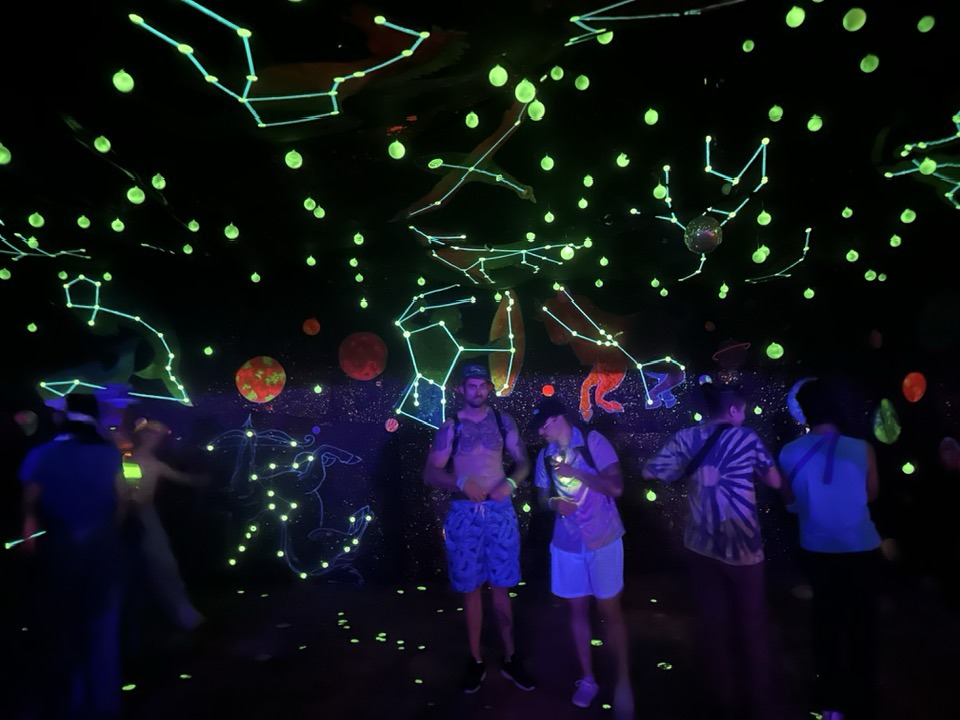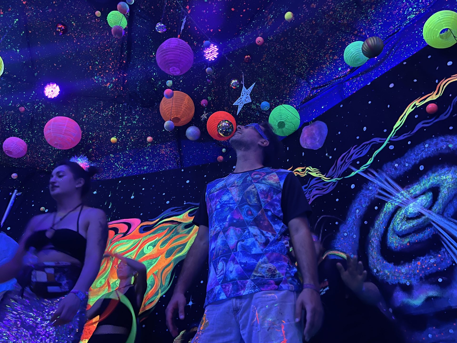 Immersive, hand‑painted environments created for Insomniac’s Countdown NYE, Nocturnal Wonderland, Moonrise Festival, Lost Lands Festival, Lightning in a Bottle, Sherman Library & Gardens’ Nights of 1000 Lights, a Fortune 500 tech company at their headquarters, and the Museum of Contemporary Art San Diego. These installations were experienced by tens of thousands of attendees across major festivals, with environments built for crowds ranging from 20,000 to over 60,000 people. The builds were full 3D blacklight installations, featuring UV‑reactive murals and sculptural elements designed to “lift” off the walls when viewed through 3D glasses, creating walk‑through dimensional worlds of color, depth, and atmospheric effects. My contributions spanned scenic painting, fabrication support, and on‑site installation, with occasional live bodypainting and performance elements integrated into the activation. (NDA‑restricted projects are listed without photos.)